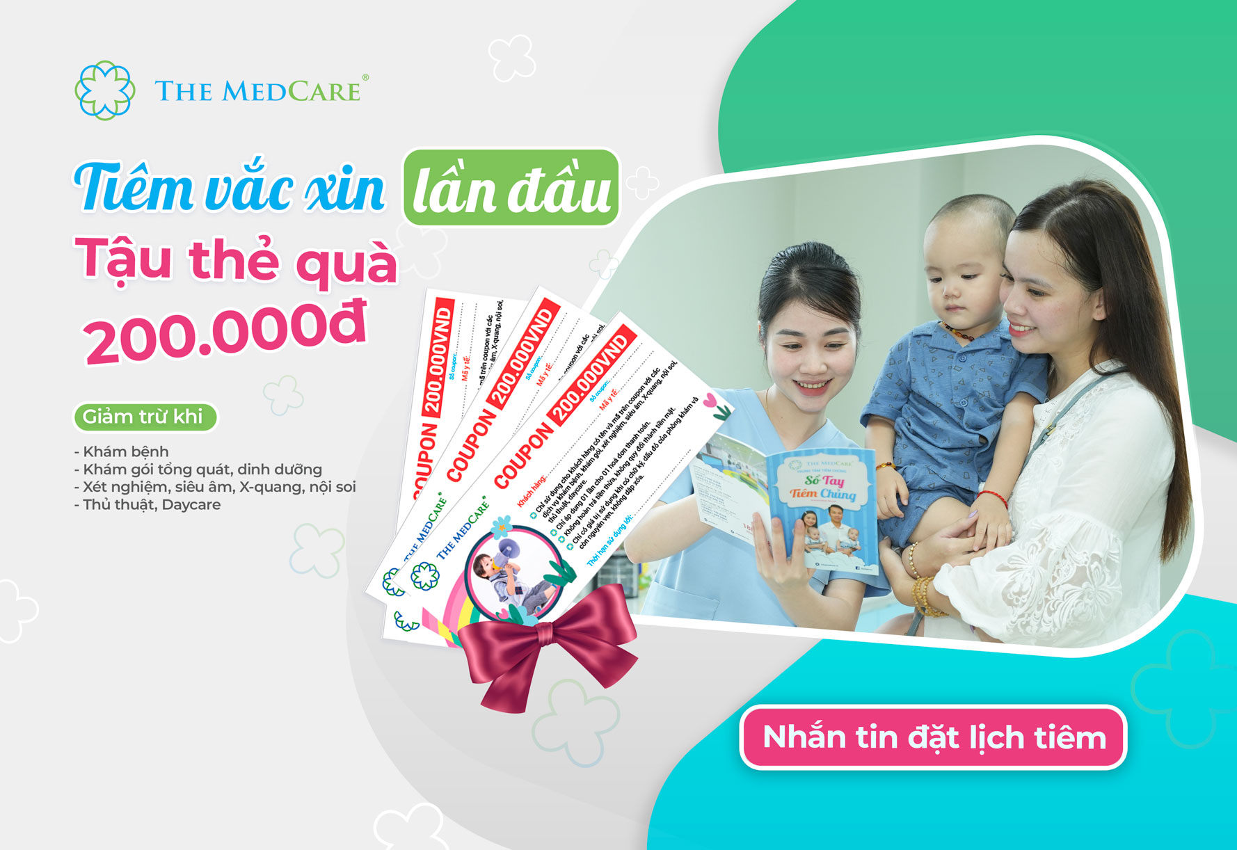 TIÊM VẮC XIN LẦN ĐẦU – TẬU THẺ QUÀ 200.000Đ Chỉ cần là khách hàng lần đầu tới The Medcare và đăng ký tiêm vắc xin, bạn sẽ sở hữu ngay tấm thẻ sức khỏe “định danh chính chủ” trị giá 200.000đ, áp dụng giảm trừ khi sử dụng các dịch vụ tại phòng khám:- Khám