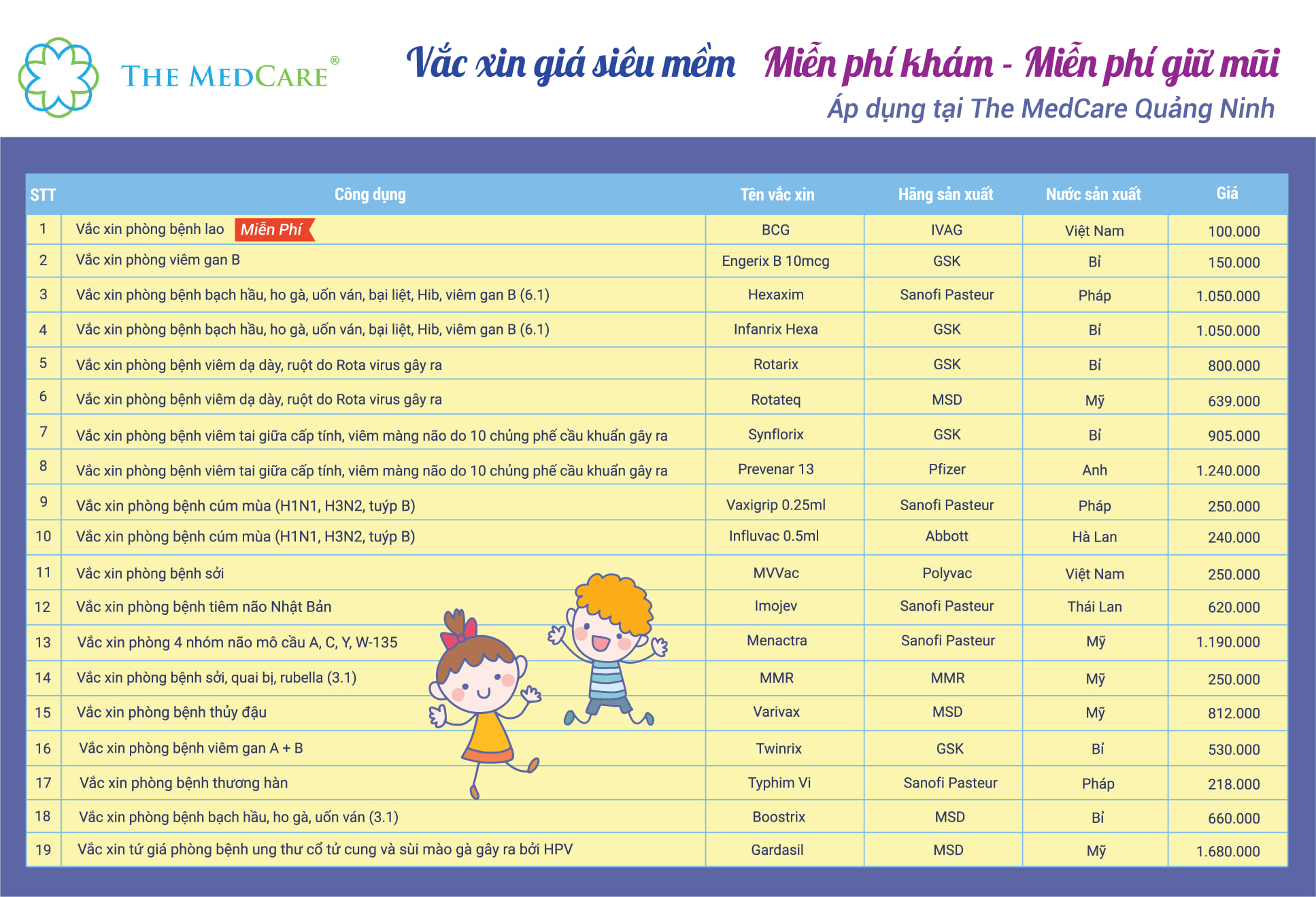 VẮC XIN GIÁ SIÊU MỀM: MIỄN PHÍ KHÁM – MIỄN PHÍ GIỮ MŨI Đừng lo lắng quá nhiều về chi phí tiêm chủng đầu đời cho trẻ, bởi nếu chọn The Medcare Quảng Ninh, ba mẹ sẽ tiết kiệm được đáng kể: Miễn phí khám sàng lọc trước tiêm (trị giá 150.000đ) cho mỗi lượt