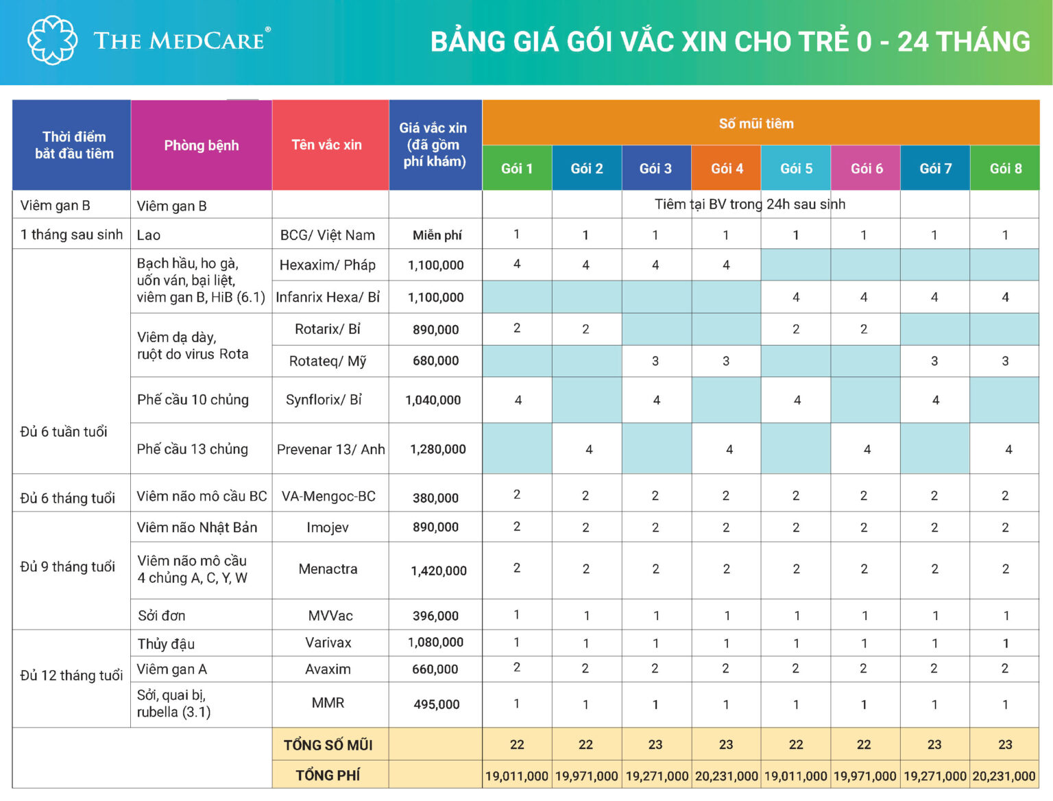 BẢNG GIÁ GÓI VẮC XIN 0-24 THÁNG CHO TRẺ