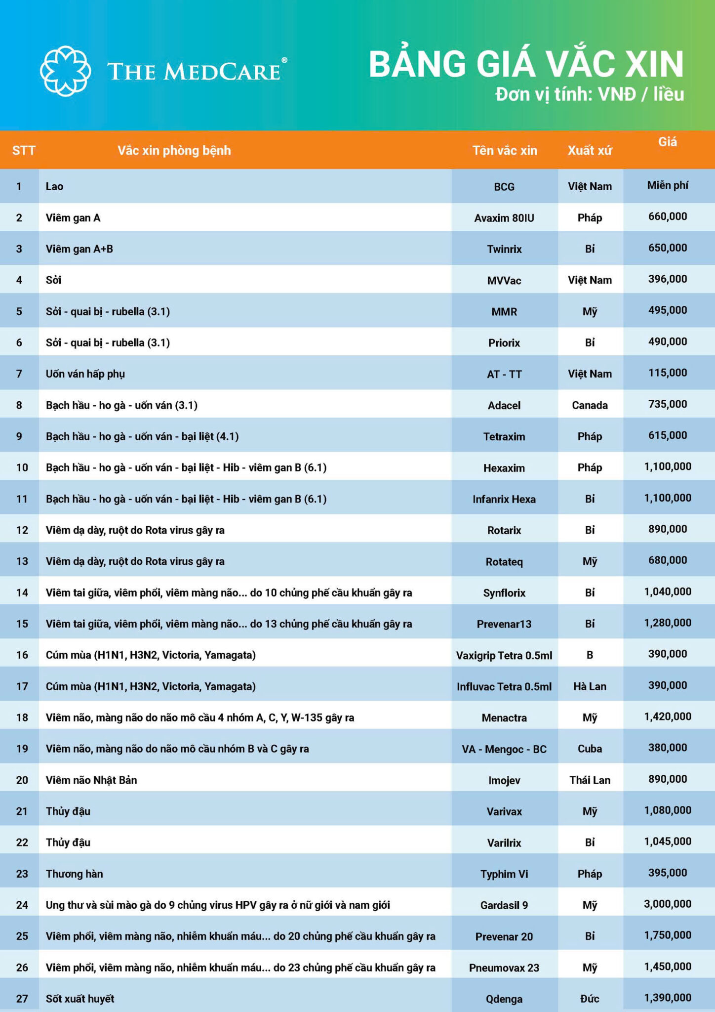 The Medcare cung cấp dịch vụ khám, tư vấn và chích ngừa các loại vắc xin cần thiết cho trẻ từ khi vừa sinh ra cho tới lúc trưởng thành, bao gồm: