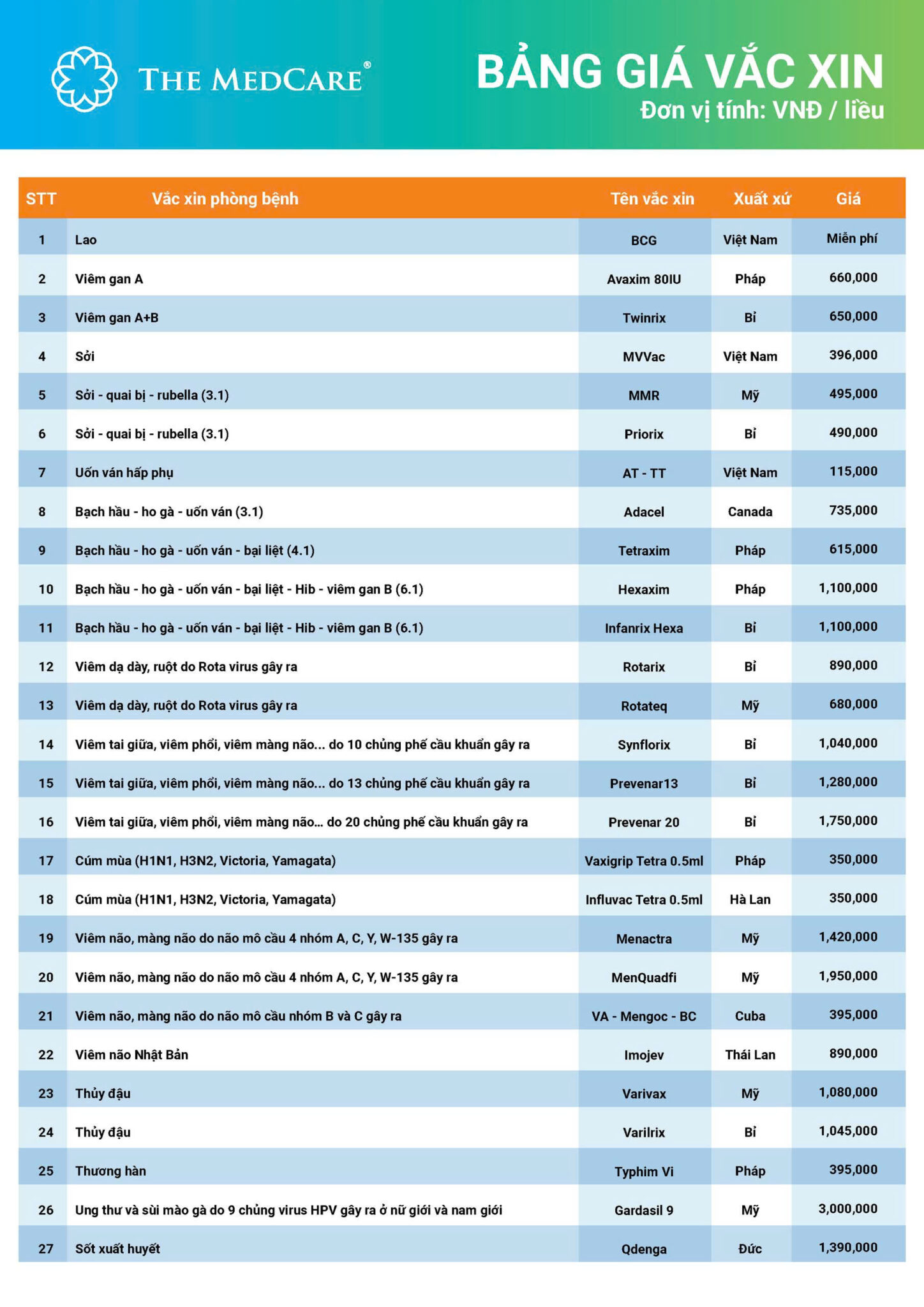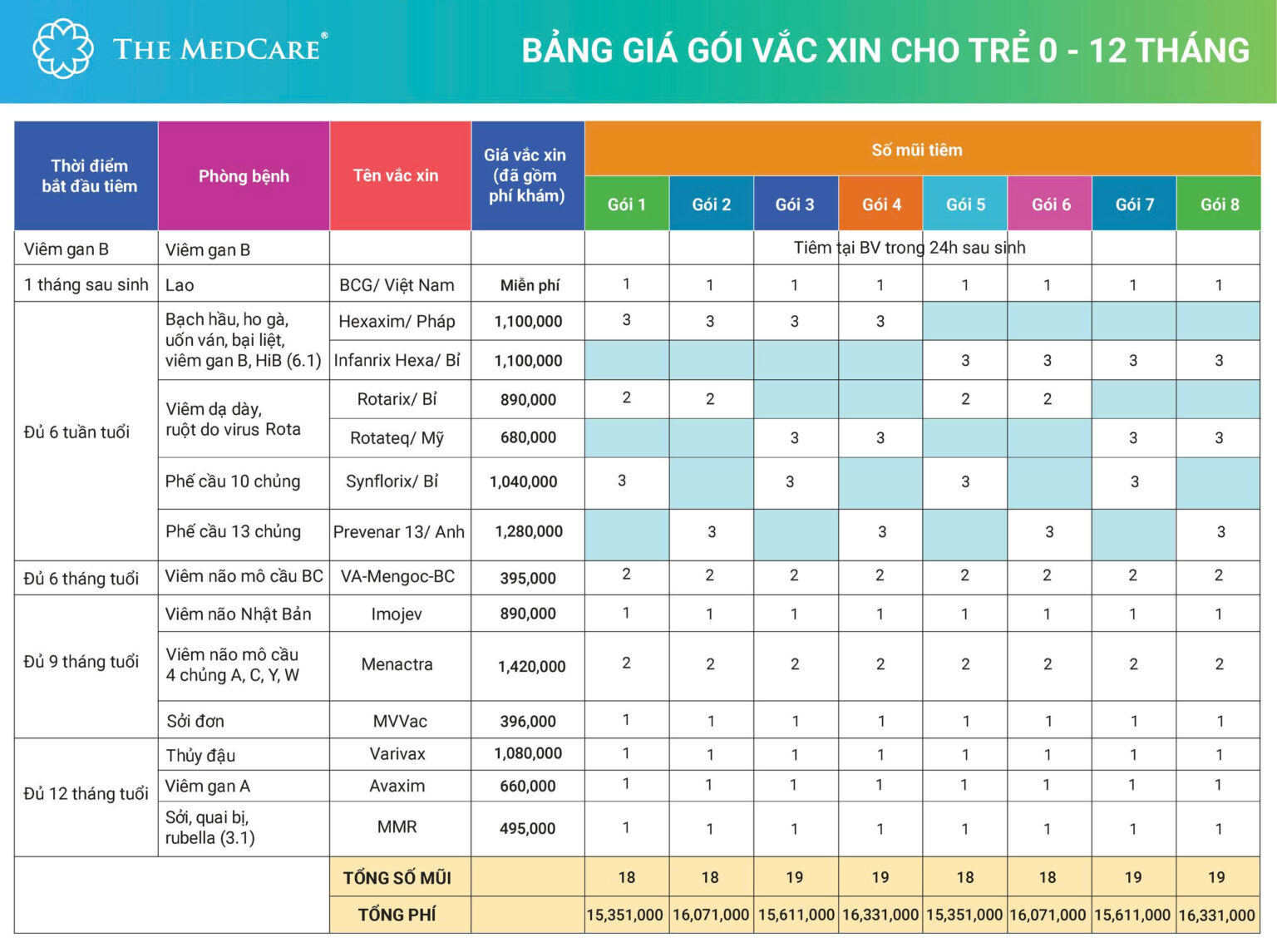 BẢNG GIÁ GÓI VẮC XIN 0-12 THÁNG CHO TRẺ