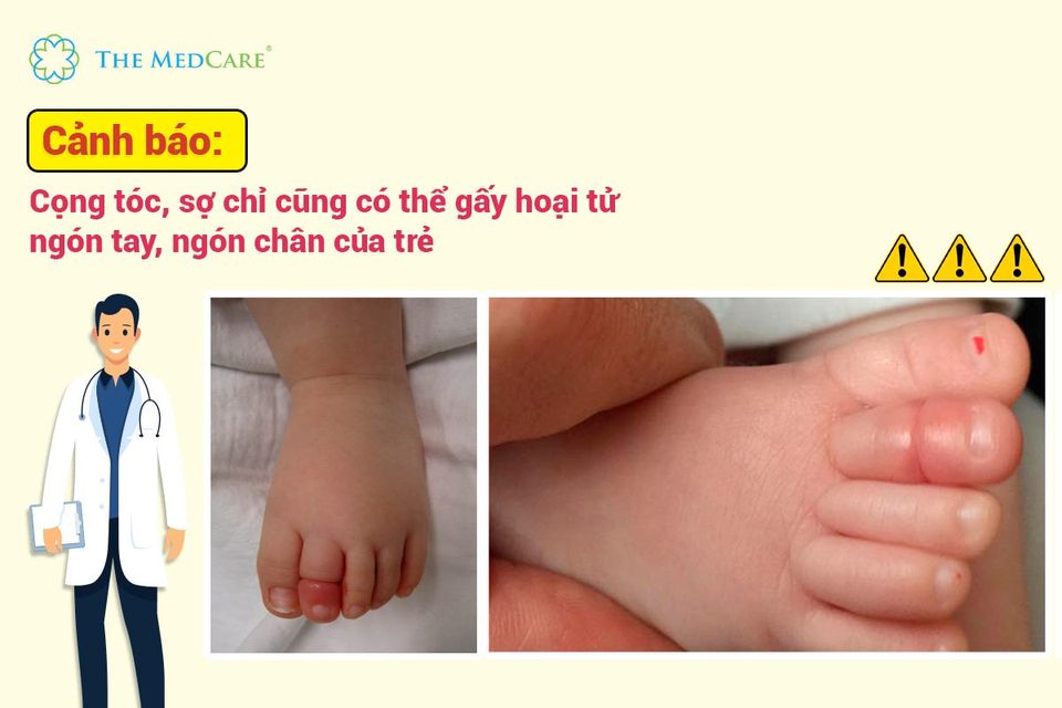CỌNG TÓC, SỢI CHỈ CŨNG CÓ THỂ GÂY HOẠI TỬ NGÓN TAY, NGÓN CHÂN CỦA TRẺ Tưởng như vô hại nhưng chính những cọng tóc, sợi chỉ mảnh mai có thể cuốn quanh và siết chặt ngón tay, ngón chân, bộ phận sinh dục của bé, gây giảm máu nuôi, nếu phát hiện sớm chỉ